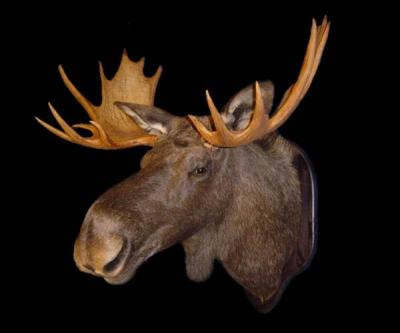 Hode med hud/skinn, montert på plakett (også med gevir, nakke og skulder)